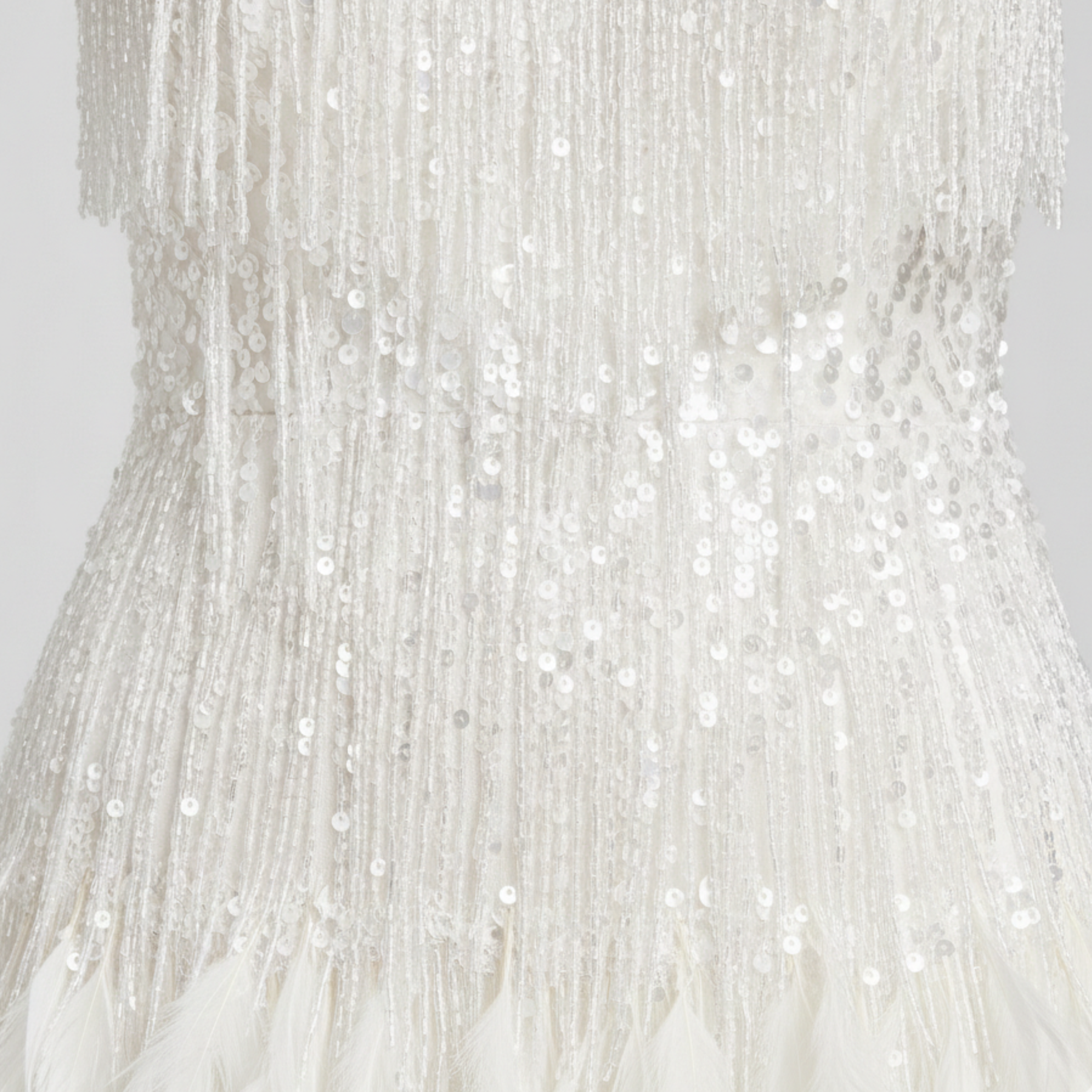 This women’s cocktail dress features a sleeveless design with thin straps, a V neckline, and a fitted mini silhouette. The bodice is detailed with fringe texture, while the hem includes feather trim for added movement. Suitable for parties, evening events, and formal occasions, this short dress pairs with heels and accessories for complete event styling.
