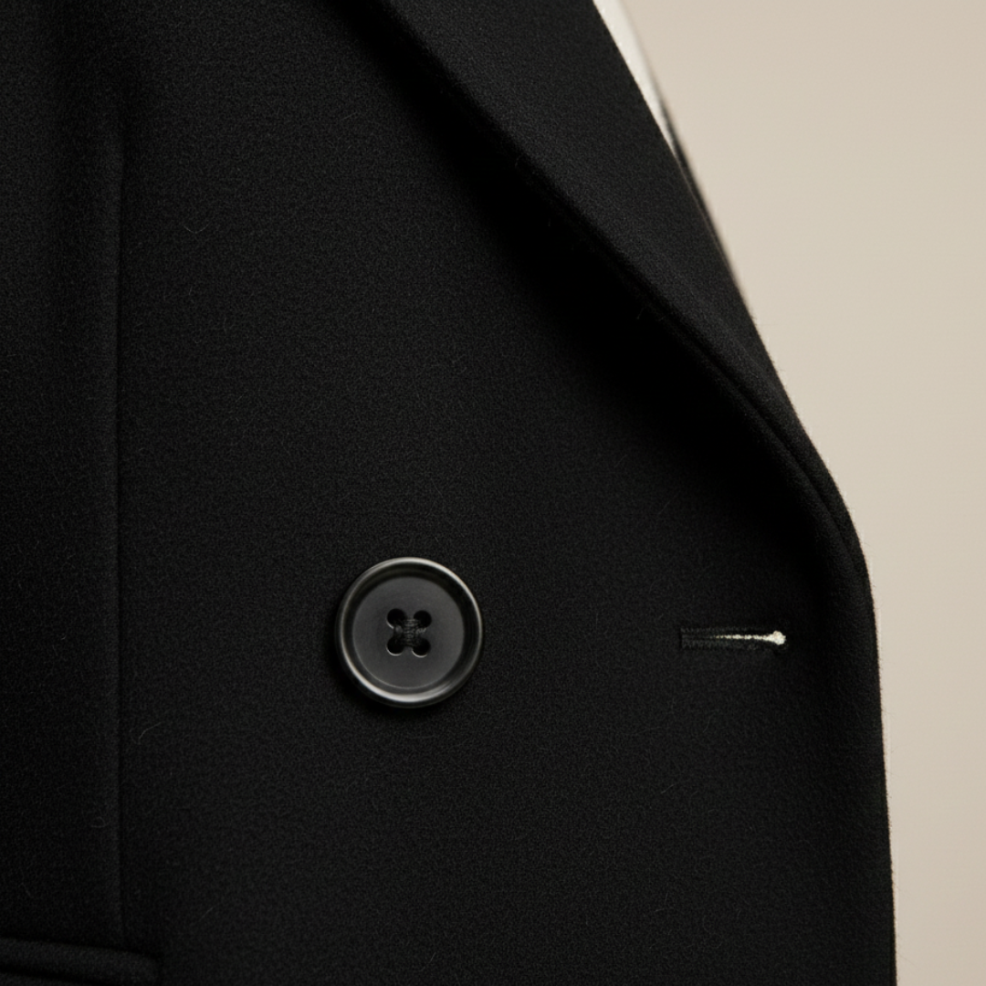 A woman in a long, tailored coat with a notched lapel, standing on a cobblestone street, exuding effortless sophistication.