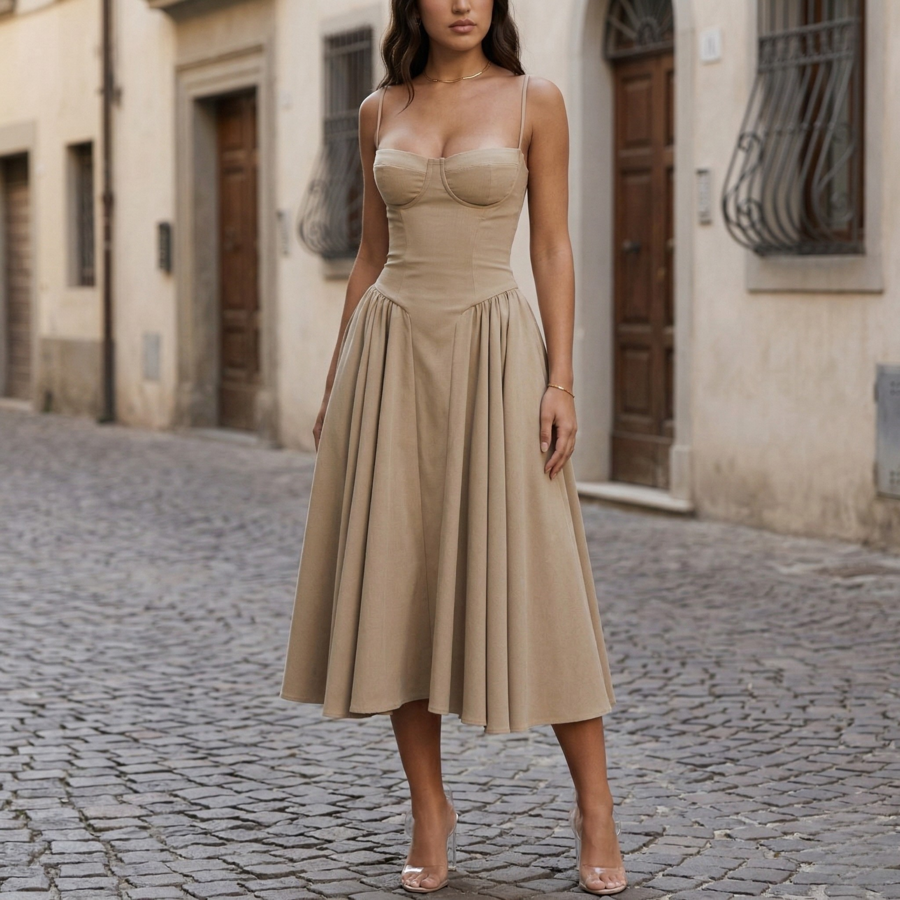 Embrace timeless femininity with this women’s floral sweetheart midi dress, designed to highlight elegance and grace. Featuring delicate spaghetti straps and a flattering sweetheart neckline, this dress enhances the silhouette with a fitted bodice and a beautifully flared A-line skirt. Pair it with heels for an elegant formal look or with sandals for a chic daytime ensemble. A perfect choice for those who love classic style with a modern feminine touch.